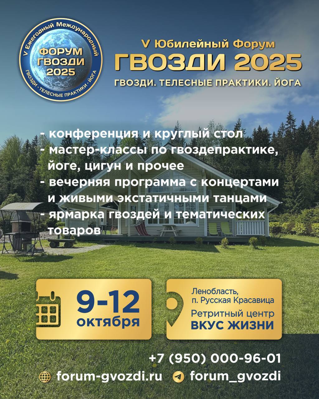 Форум «ГВОЗДИ» — это ежегодная встреча практиков и исследователей, объединённых интересом к телесным практикам, йоге, медитациям и гвоздестоянию.